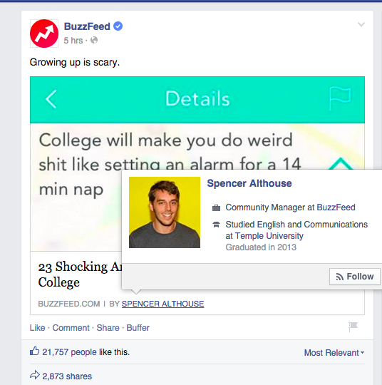 في أشارة إلى الفيسبوك أن مُحرر تلك المقالة هو “AndrewA. Gendi” ويُمكنك أن تضيف حسابك الشخصي، أو صفحتك الخاصة على الفيسبوك، أو حتي صفحة الموقع .. وتمكن تلك الخاصية المُستخدم من متابعتك أو الإعجاب بصفحتك على الفيسبوك بكل سهولة عبر الوقوف بالفأرة على الرابط ثم الضغط على زر Follow أو Like.